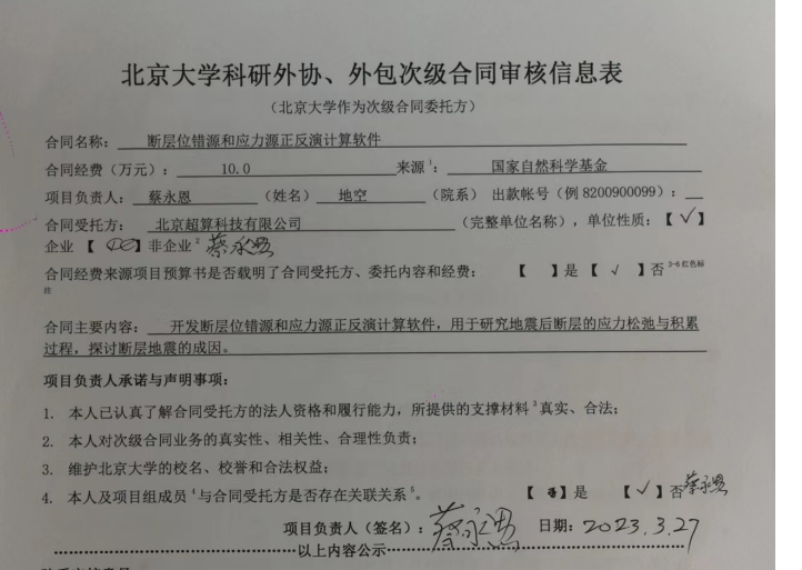 根据《关于北京大学理工科科研次级合同管理的通知》,现将北京大学理工科科研次级合同“断层位错源和应力源正反演计算软件”的相关内容予以公示。公示时间:2023年03月27日-2023年03月29日(3个工作日)。合同相关纸质材料可经预约后到勺园5乙330办公室进行查阅。