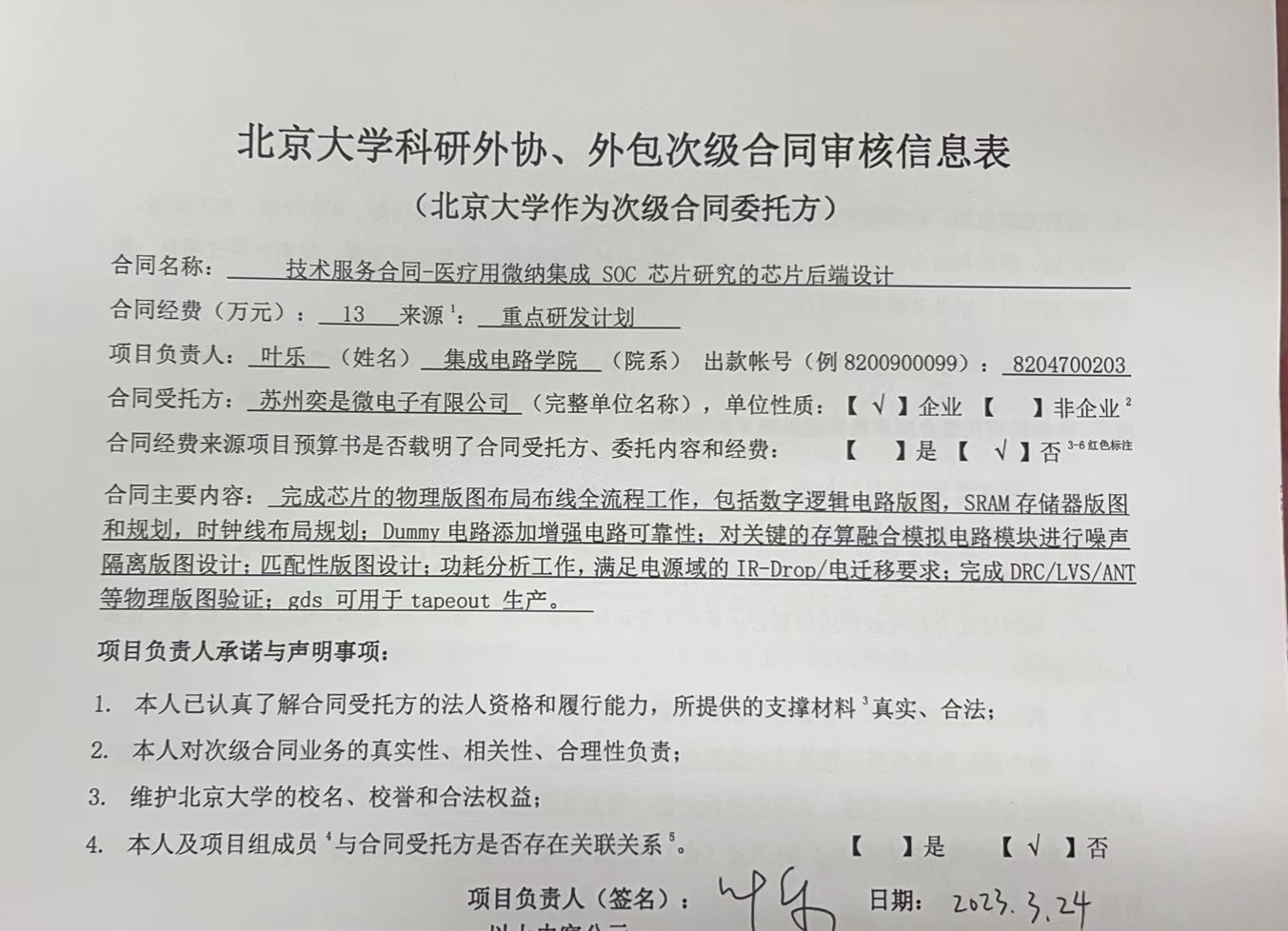 根据《关于北京大学理工科科研次级合同管理的通知》,现将北京大学理工科科研次级合同“技术服务合同-医疗用微纳集成SOC芯片研究的芯片后端设计”相关内容予以公示。