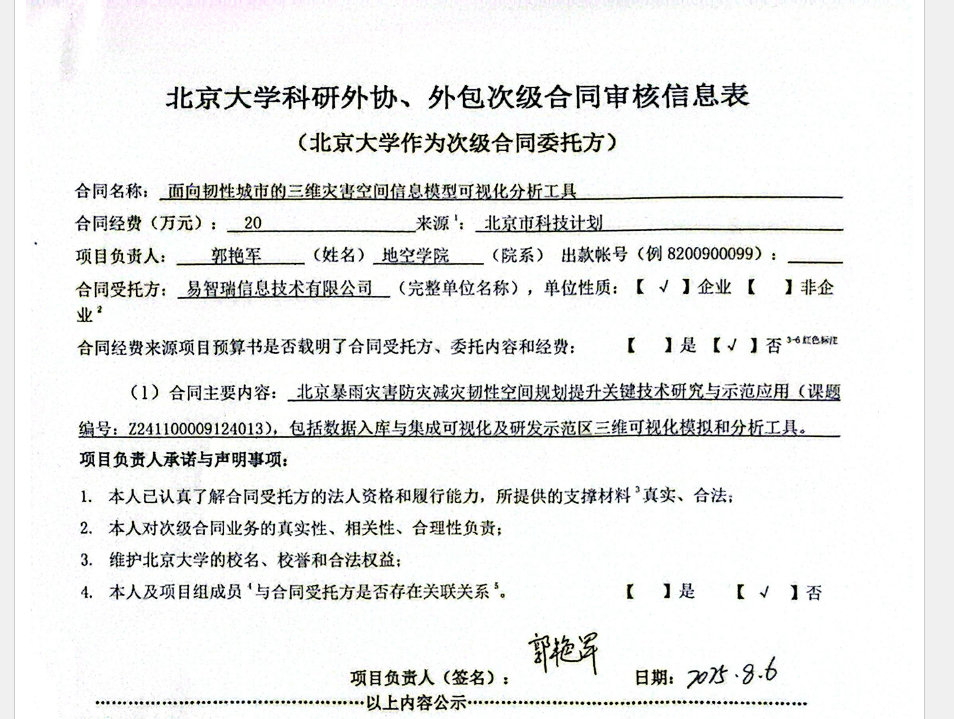 根据《关于北京大学理工科科研次级合同管理的通知》,现将北京大学理工科科研次级合同“面向韧性城市的三维灾害空间信息模型可视化分析工具”相关内容予以公示。