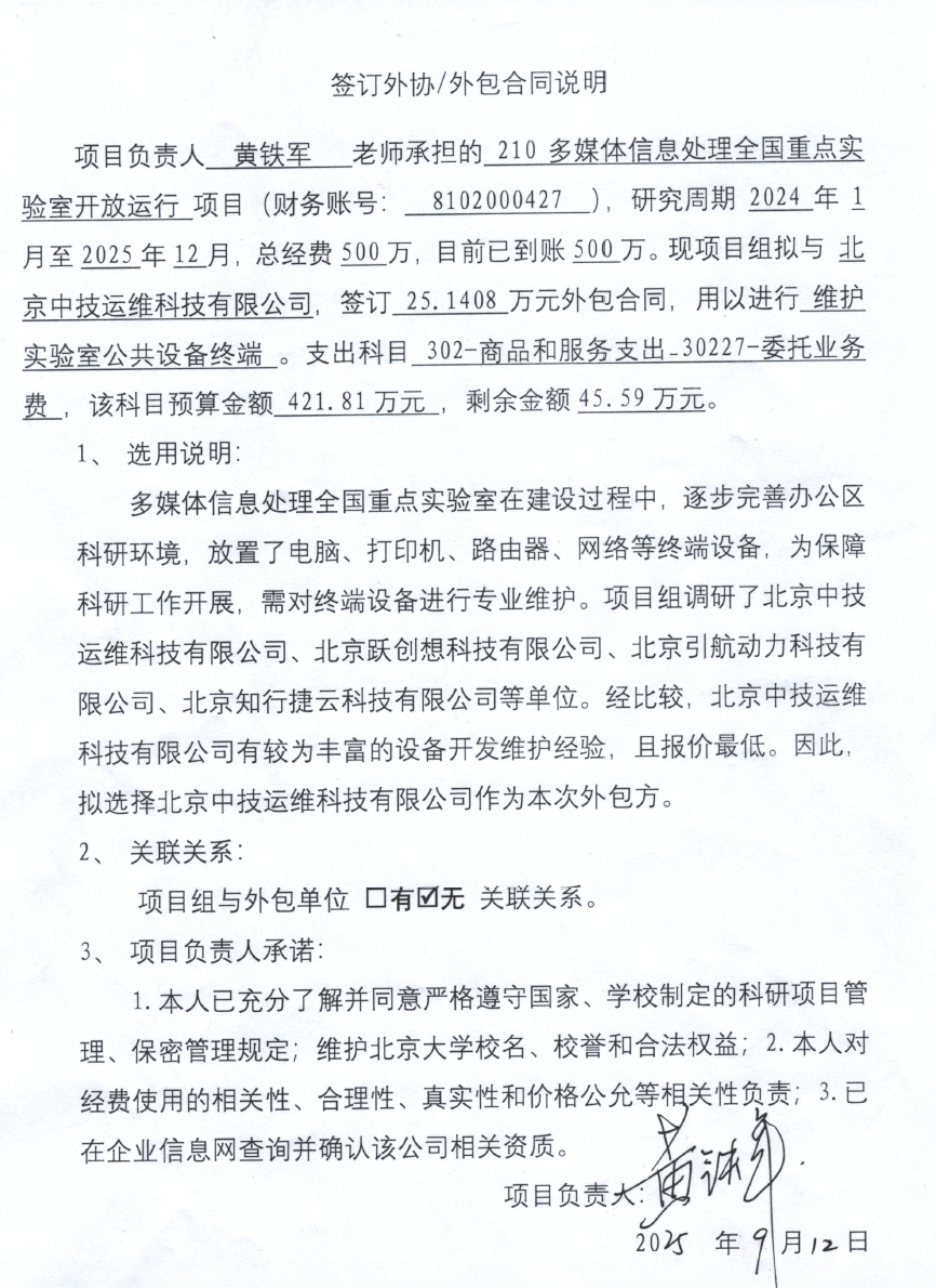 根据《关于北京大学理工科科研次级合同管理的通知》,现将北京大学理工科科研次级合同“多媒体处理全国重点实验室终端运维服务合同”相关内容予以公示。