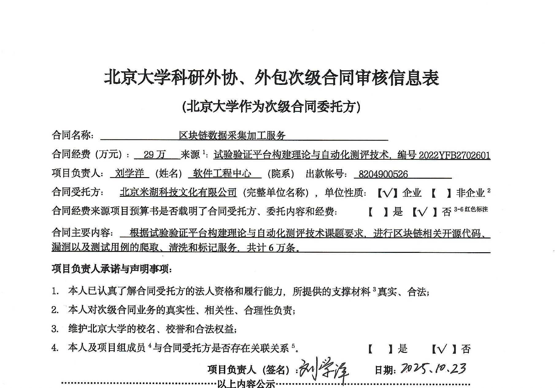 根据《关于北京大学理工科科研次级合同管理的通知》,现将北京大学理工科科研次级合同“区块链数据采集加工服务”相关内容予以公示。
