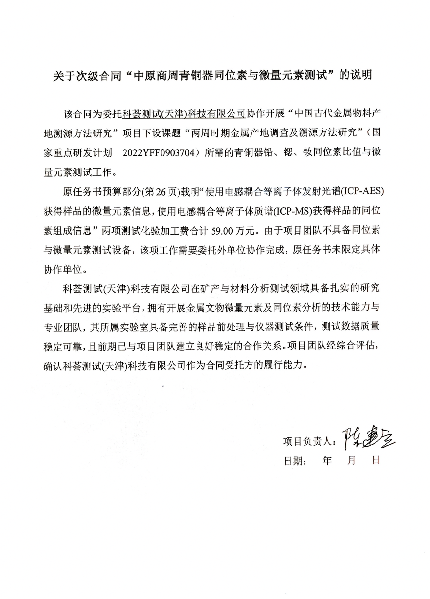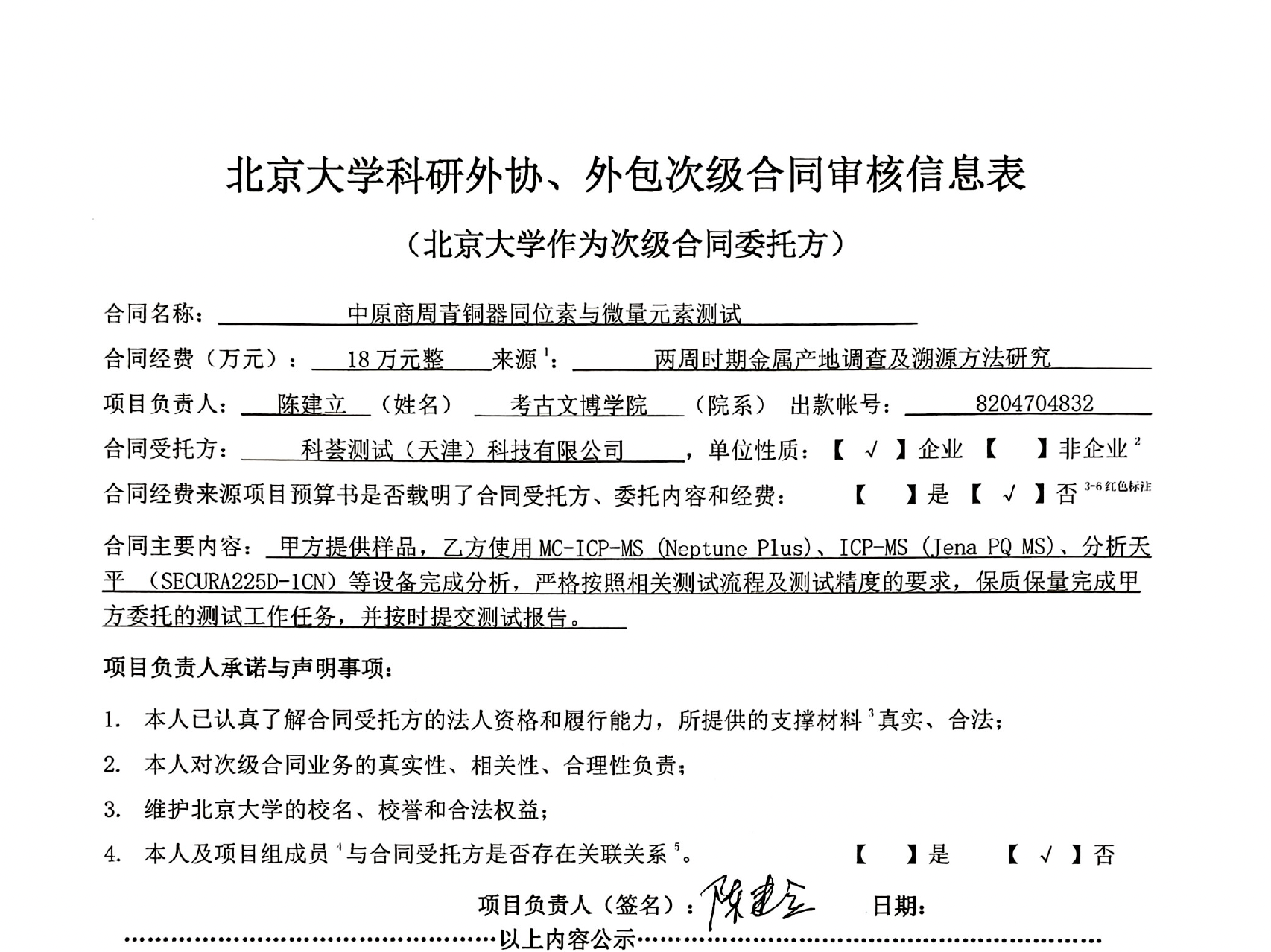 根据《关于北京大学理工科科研次级合同管理的通知》,现将北京大学理工科科研次级合同“中原商周青铜器同位素与微量元素测试”相关内容予以公示。